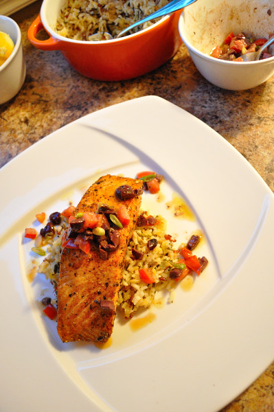 To plate: Mound rice in the center, or just off center of the plate, top with salmon fillet then a generous spoon-full of the tomato olive relish, finishing with a drizzle of oil around the plate. Serve immediately.