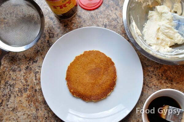 - Once the pancakes are cool to the touch start your assembly. Place a pancake on the plate, brush it well with boozy coffee mixture. Take about a tablespoon of mascarpone mixture and spread it gently on the pancake then place a pancake on top and repeat until done. Dust with cocoa on top either serve immediately or reserve cold until needed.