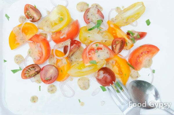 This is an everyday salad at Chez Gypsy. A staple of French country cooking, Tomato Salad with Mustard Vinaigrette is the perfect cold side on a hot summer day.