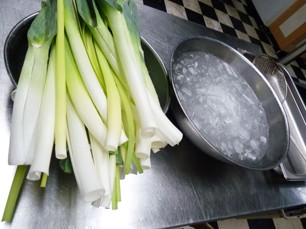 3) Clean and separate leek leaves, being sure to remove all grit. Blanch and shock leek leaves in the same manner as you did with the vegetables above. They take much less time, just a few seconds until soft and malleable.