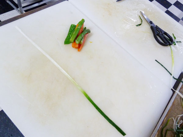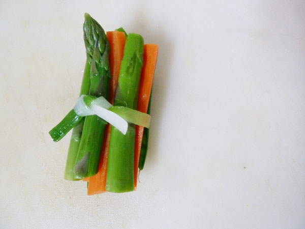 1) Peel and cut vegetables to size; here we’re working with approximately two and a half inch asparagus spears, or a combo of asparagus, carrot sticks and snow peas. If you want to get all fancy, try miniature vegetables, tops intact.