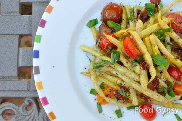 Fresh beans are beginning to flood the local markets. Green beans, wax beans, long thin Asian beans; all fresh and flashy and waiting to be served. This salad has become one of my favorite late-summer sides to take advantage of the garden’s bounty. Cherry tomatoes, garlic, shallots, and smokey bacon with a dash of sherry vinegar and fresh basil makes a combination that hits so many flavour notes in this Wax Bean Salad in Bacon Vinaigrette.