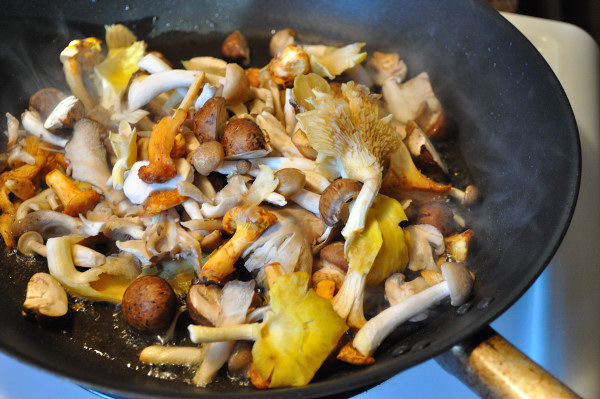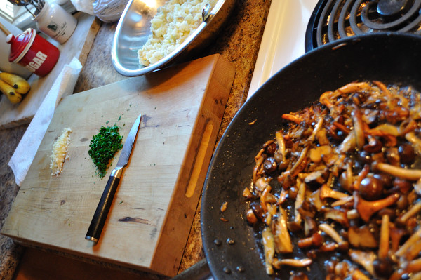 This hash has six ingredients; leftover potatoes, wild mushrooms, garlic, parsley, butter & oil. We used two 3.5 oz packages fresh of Chef’s Mix mushrooms from Pronderosa Mushrooms in Port Coquitlam BC (which happens to be my hometown). Chef B was so happy with the selection and quality, they’ve become his new favorite commercial mushroom mix. A blend of six to eight cultivated and wild mushrooms – the mix can vary depending on seasonal availability. Fresh and tasty.