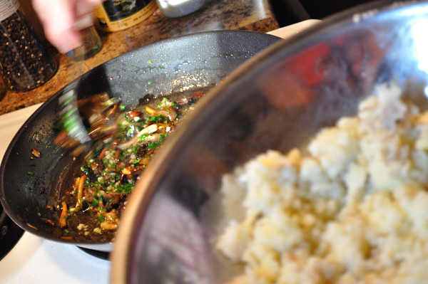 Reduce heat to medium, add garlic and fresh chopped parsley (the amount of garlic should be about equal to the amount of parsley you use) to mushrooms and fold to coat, cook for about 1 minute. Add prepped cold mashed potatoes on top of mushroom garlic mixture, allow steam to bubble up. Add more oil or butter if needed to keep pan moist. Cook, tossing as necessary, for about 9 minutes, until hot with flecks of golden brown potato show through.